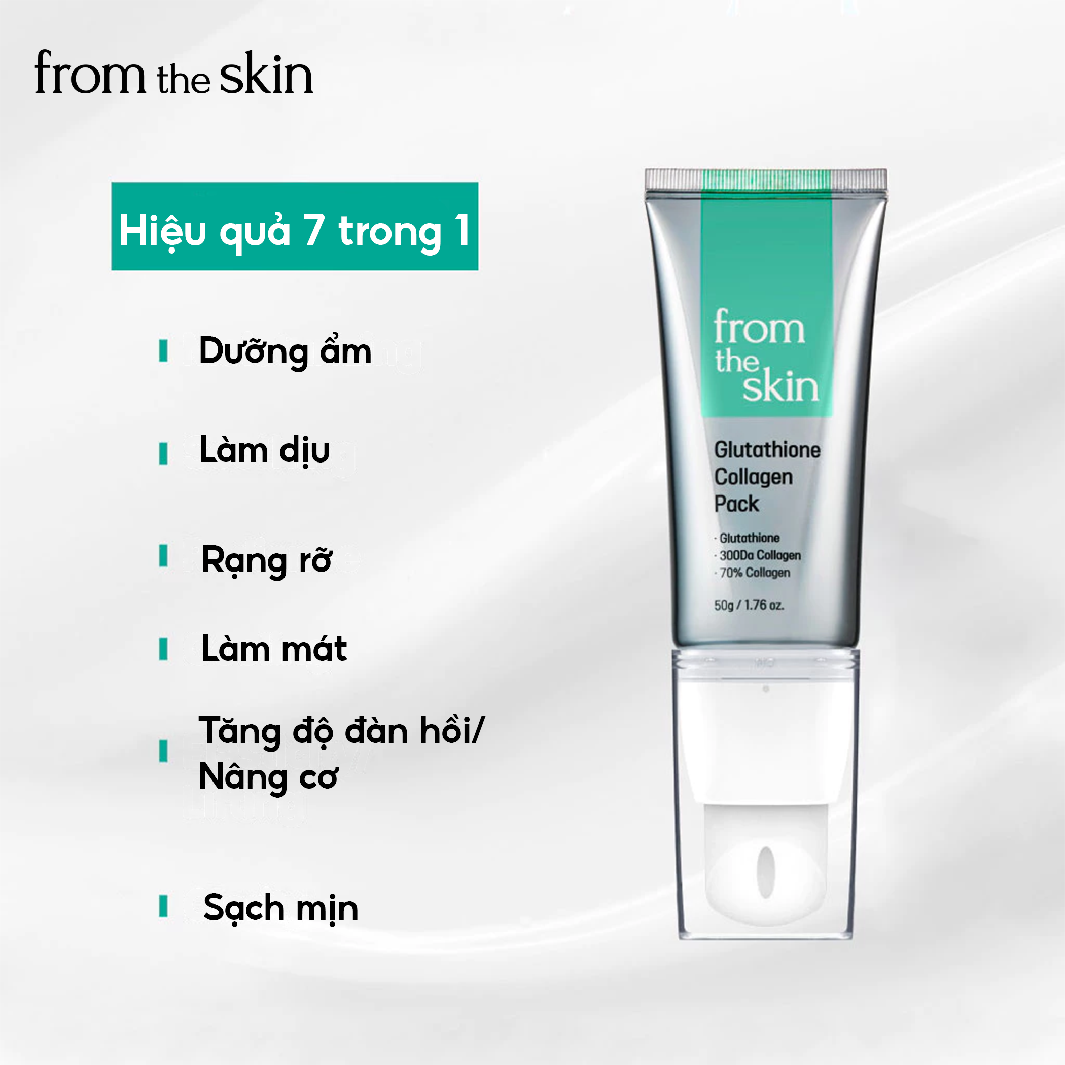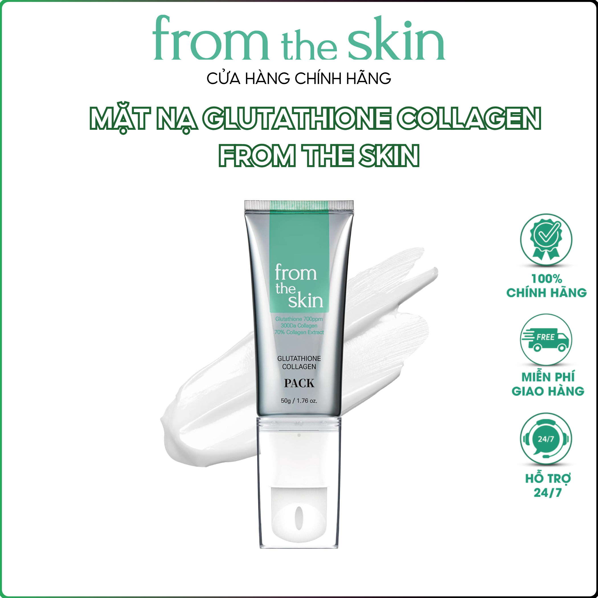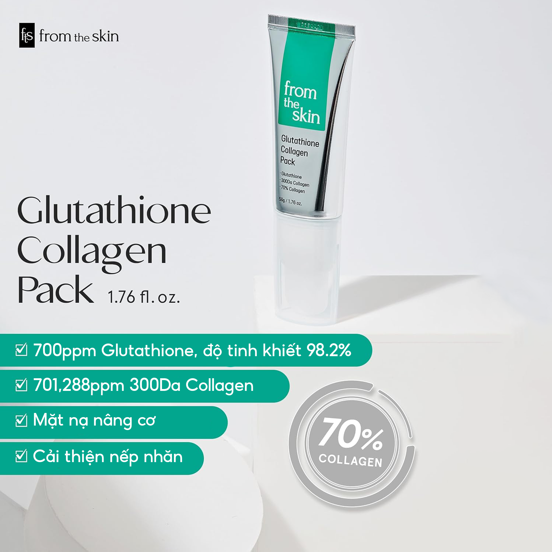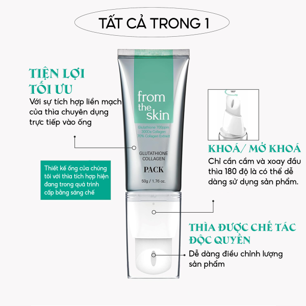 Mặt nạ rửa Glutathione Collagen Pack From The Skin 50g là giải pháp dưỡng trắng, phục hồi và tái tạo da chuẩn spa ngay tại nhà. Với công thức chứa Glutathione 0.07%, Collagen cá thủy phân cùng chiết xuất nhân sâm, hạt húng quế, men vi sinh và peptide, sản phẩm giúp làm sáng da, tăng đàn hồi, cấp ẩm và làm dịu da nhanh chóng.