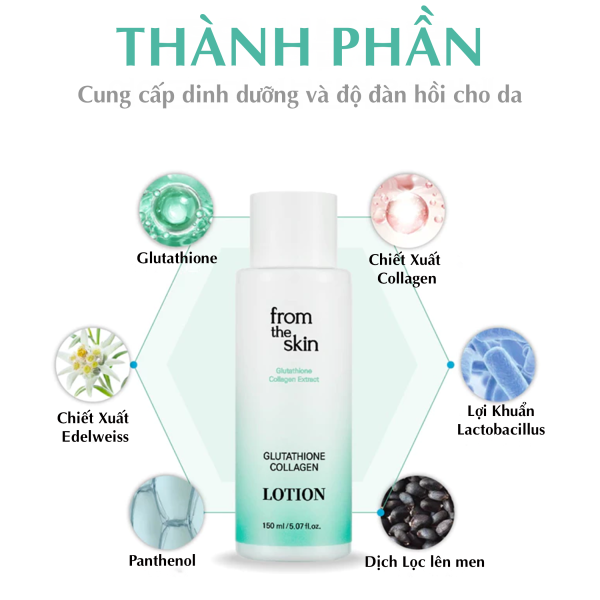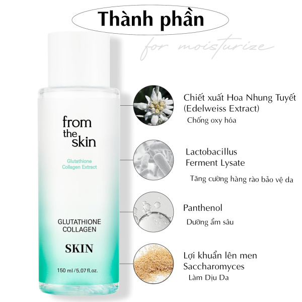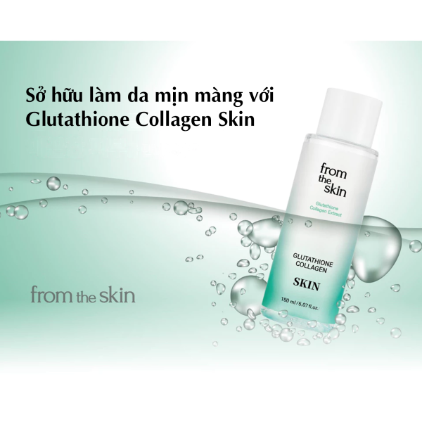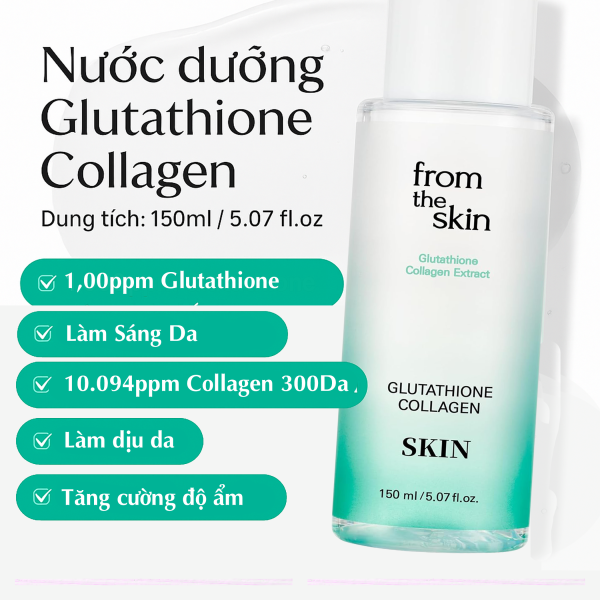 Nước dưỡng da Glutathione Collagen From The Skin 150ml là bước đệm lý tưởng giúp làm dịu, cấp ẩm và nuôi dưỡng làn da sáng khỏe, mềm mịn ngay từ bước đầu tiên trong chu trình skincare. Với sự kết hợp của Glutathione, Niacinamide, Collagen cá và các chiết xuất thiên nhiên lành tính, sản phẩm mang lại hiệu quả phục hồi, dưỡng trắng và chống lão hóa rõ rệt – đặc biệt phù hợp cho da nhạy cảm và sau treatment.